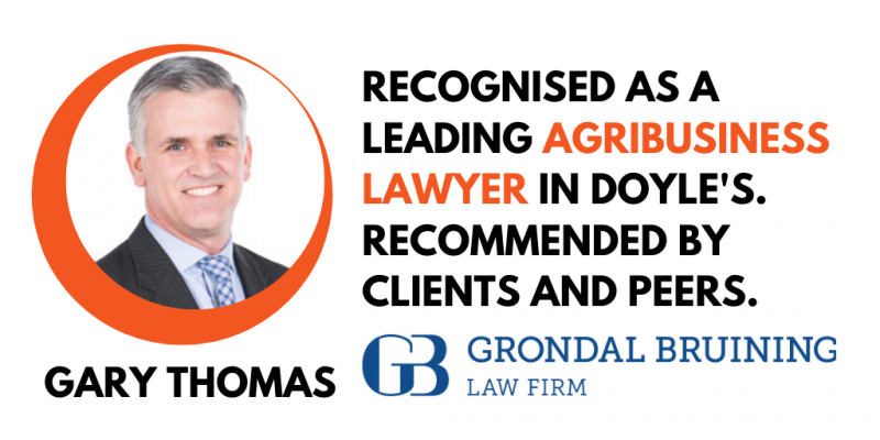 We are proud to announce that Gary Thomas, Principal of Grondal Bruining was included in the recent Doyles list of leading West Australian Agribusiness Lawyers practising in commercial agribusiness matters in the WA legal market, identified by clients and peers for his expertise and abilities. Thank you to those who nominated Gary, recognising his specialisation in this important area of law.