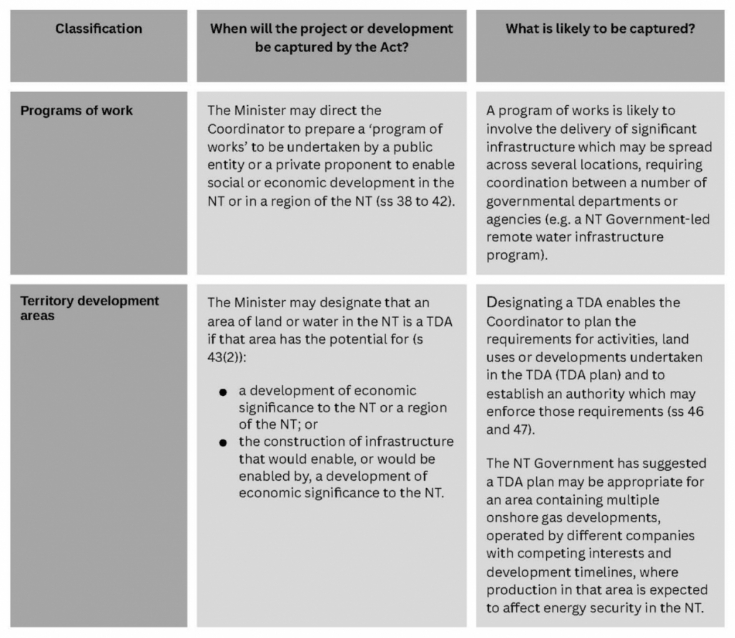 The Minister must make a declaration or designation before the specific powers can be exercised in relation to a particular project, development or any related activities. The projects which may be brought within the scope of the Act fall under three broad categories – significant projects, programs of works and Territory development areas (TDAs).