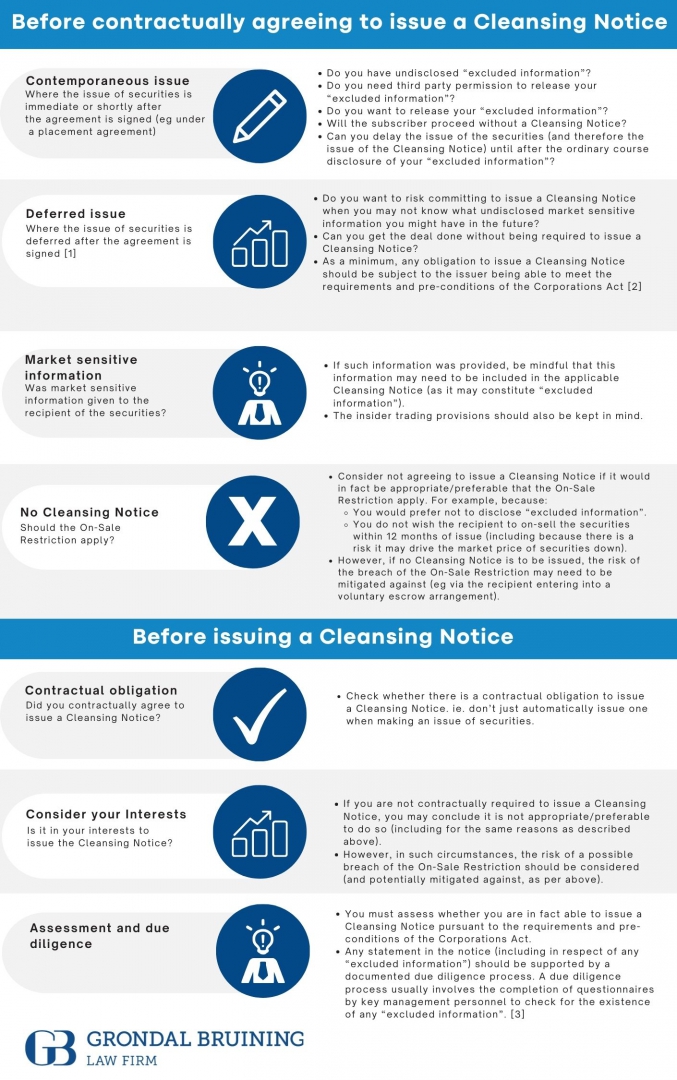 Companies should also be careful if contractually agreeing to issue a Cleansing Notice as part of a written agreement the securities are issued under (eg. under a subscription agreement for a placement).
